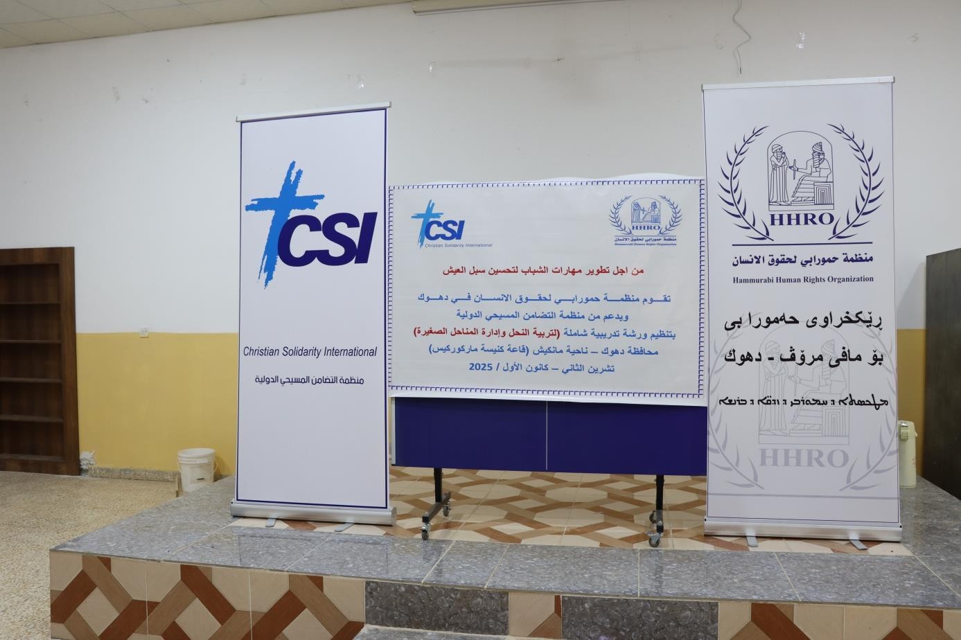 باشرت منظمة حمورابي لحقوق الإنسان، وبدعم من منظمة التضامن المسيحي الدولية (CSI)، أعمال الورشة التدريبية الشاملة لتربية النحل وإدارة المناحل الصغيرة في قاعة كنيسة مار كوركيس بناحية مانكيش في محافظة دهوك، وذلك ضمن برامج تطوير مهارات الشباب وتحسين سبل العيش.