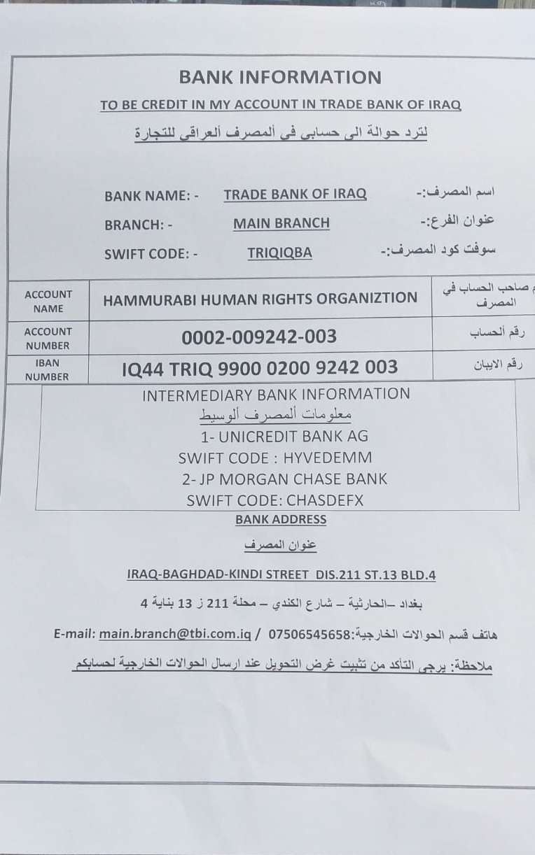 " اعلان العنوان الجديد للحساب المصرفي لمنظمة حمورابي لحقوق الانسان"