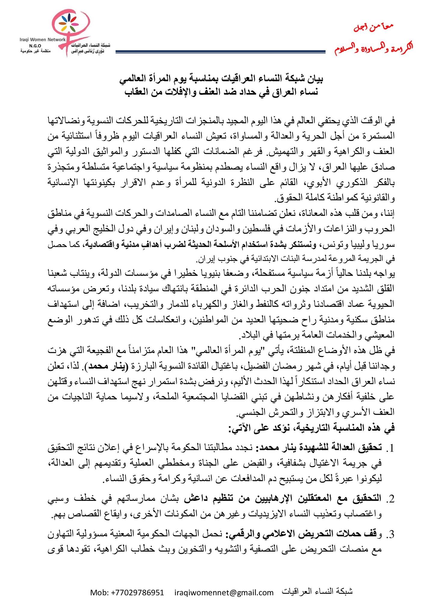 وجددت منظمة حمورابي لحقوق الإنسان تأكيدها على تضامنها مع الجهود التي تبذلها المنظمات النسوية ومنظمات المجتمع المدني للدفاع عن حقوق المرأة، والعمل من أجل مجتمع قائم على العدالة والمساواة واحترام الكرامة الإنسانية.