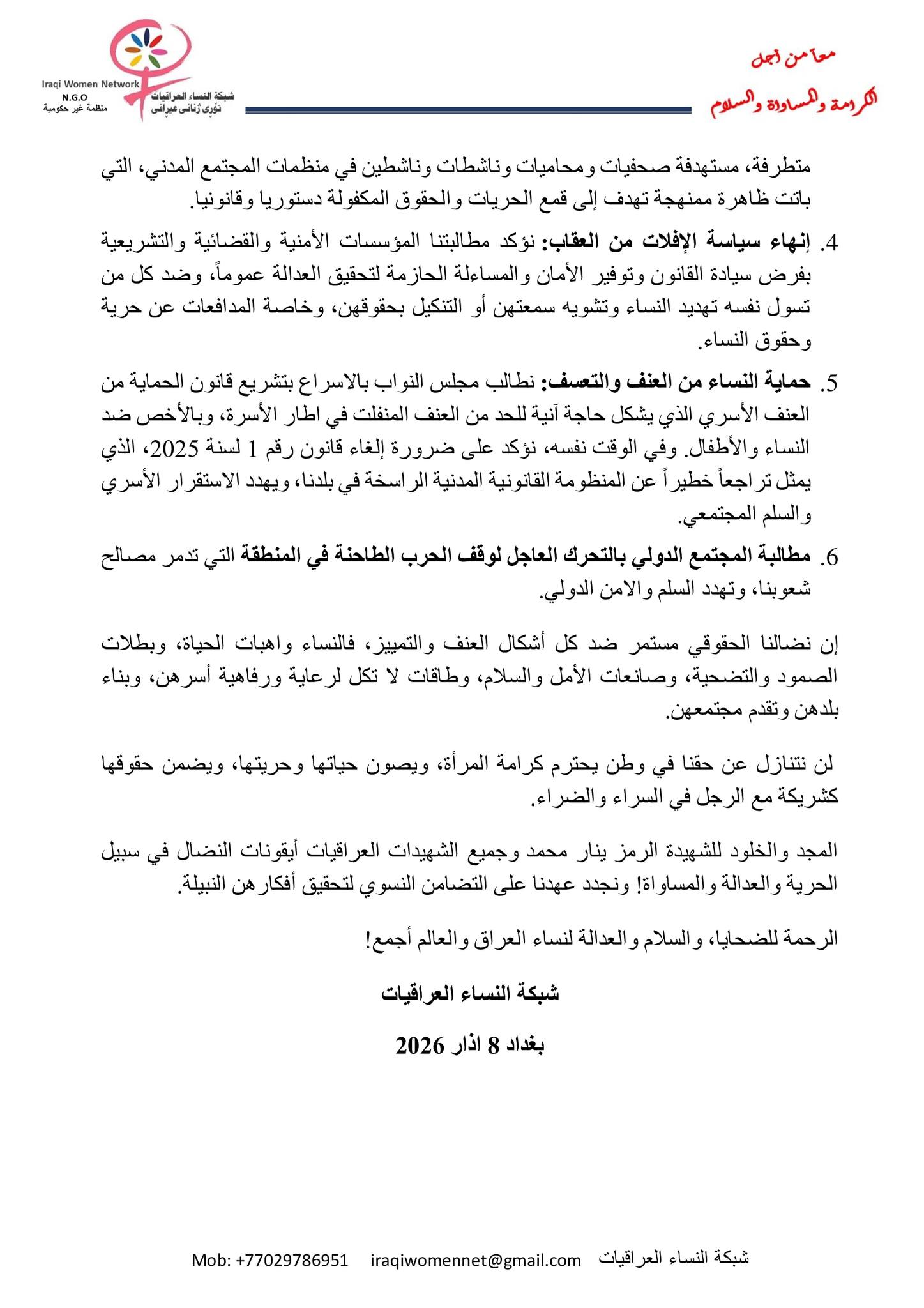 وأشارت المنظمة، بوصفها إحدى المنظمات الأعضاء في الشبكة، إلى أن البيان يعكس واقعاً مقلقاً تعيشه النساء العراقيات في ظل الظروف السياسية والأمنية والاجتماعية الراهنة، وما يرافق ذلك من تهديدات لحقوقهن الأساسية المكفولة دستورياً وقانونياً. كما أكدت أن ما ورد في البيان يمثل دعوة مهمة لتعزيز سيادة القانون وحماية المدافعات عن حقوق الإنسان والناشطات في المجتمع المدني.