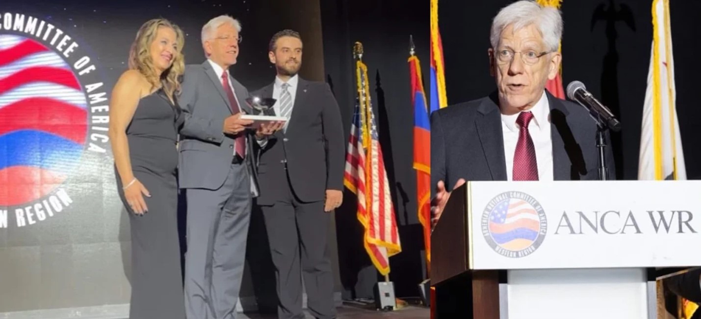 قدّمت لينا هوفانيسيان وكيفورك هاغوبجيان جائزة حقوق الإنسان إلى جون إيبنر (في الوسط). على اليمين: جون إيبنر خلال خطابه. المصدر: ANCA-WR
